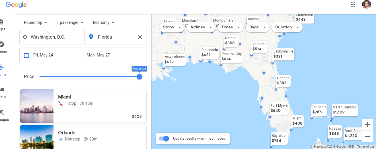 There are plenty of tools to help you plan last-minute travel. Google Flights has a great "Explore" option to inspire you if you know when, but not where, you want to go. Let's say you want to go from DC to Florida on Memorial Day weekend, but don't care which city. By entering your departure, dates, and "Florida" in the arrival box, you'll get a map that looks like the one below. The map shows you that the cheapest beach-adjacent flight goes to Jacksonville for $331.
