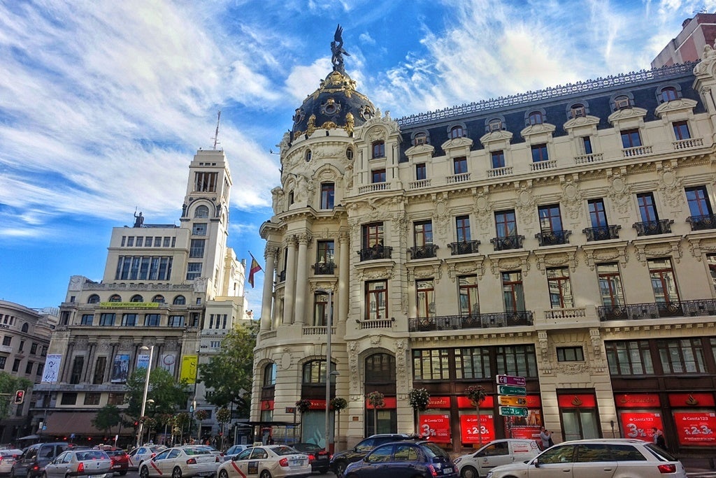Continue your tour by crossing through Plaza España to walk the length of Calle de Gran Vía, one of Madrid's most famous streets. Enjoy the glamour of the theaters, shops and grandiose architecture. Stop to admire the famous Metropolis building, which has 30,000 leaves made out of 24-carat gold covering the top.