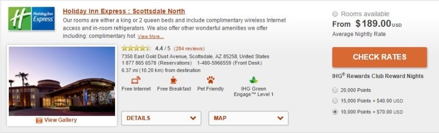 IHG's Points & Cash redemptions are pretty straightforward. There are several options: At most properties, you can either pay $40 per night to save 5,000 points on your award rate or you can pay $70 to save 10,000 points. IHG Rewards also just added a third option at some of its upper-tier properties, allowing you to pay $90 to save 15,000 points per night.