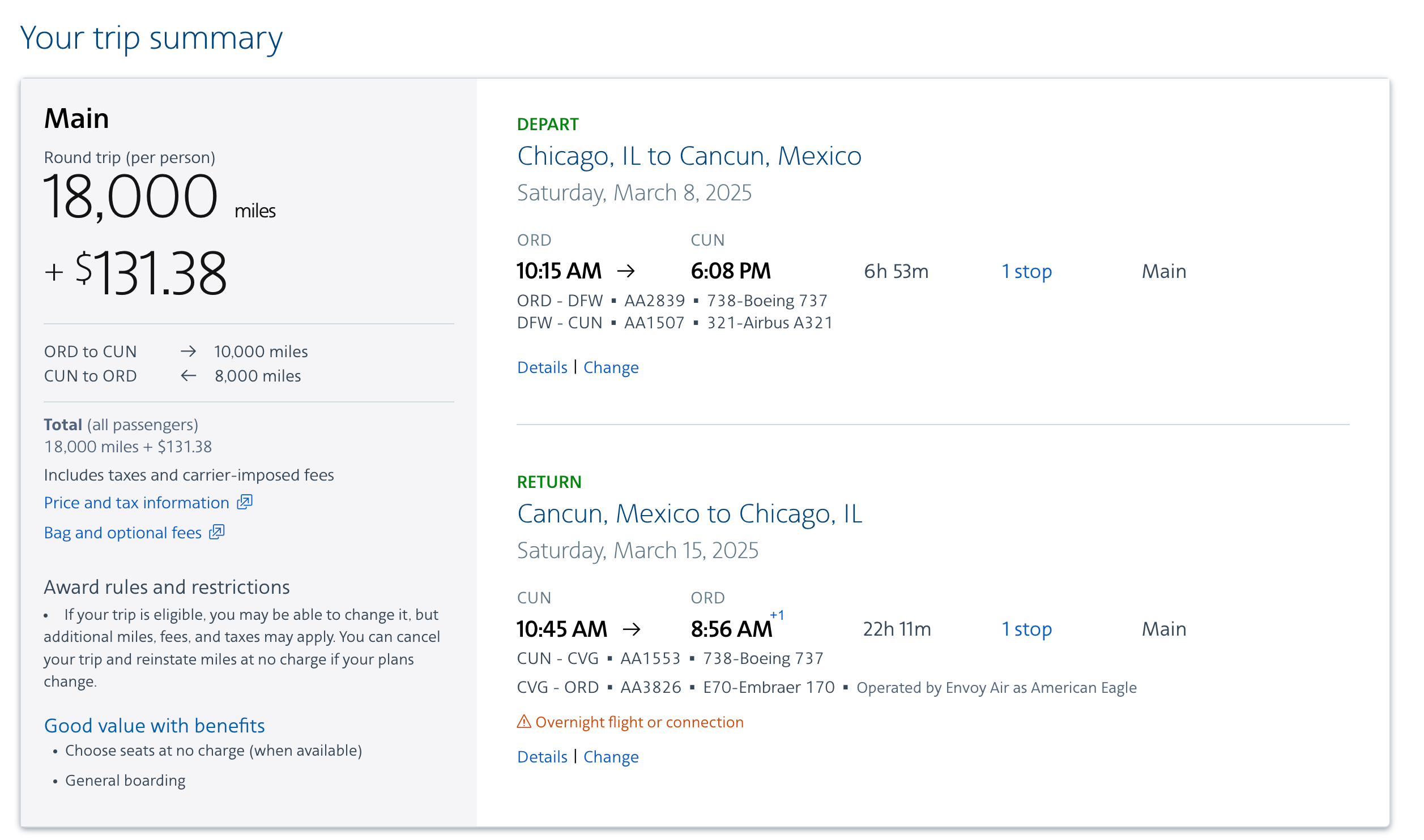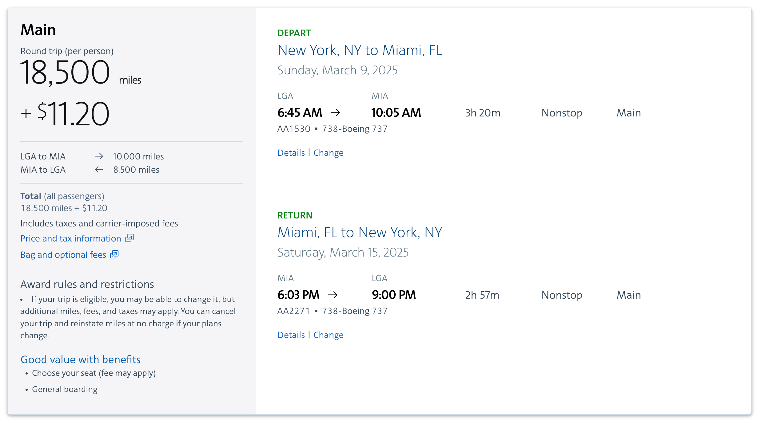 American Airlines has round-trip flights from many U.S. cities from as low as 18,000 AAdvantage miles, depending on travel dates and origin.