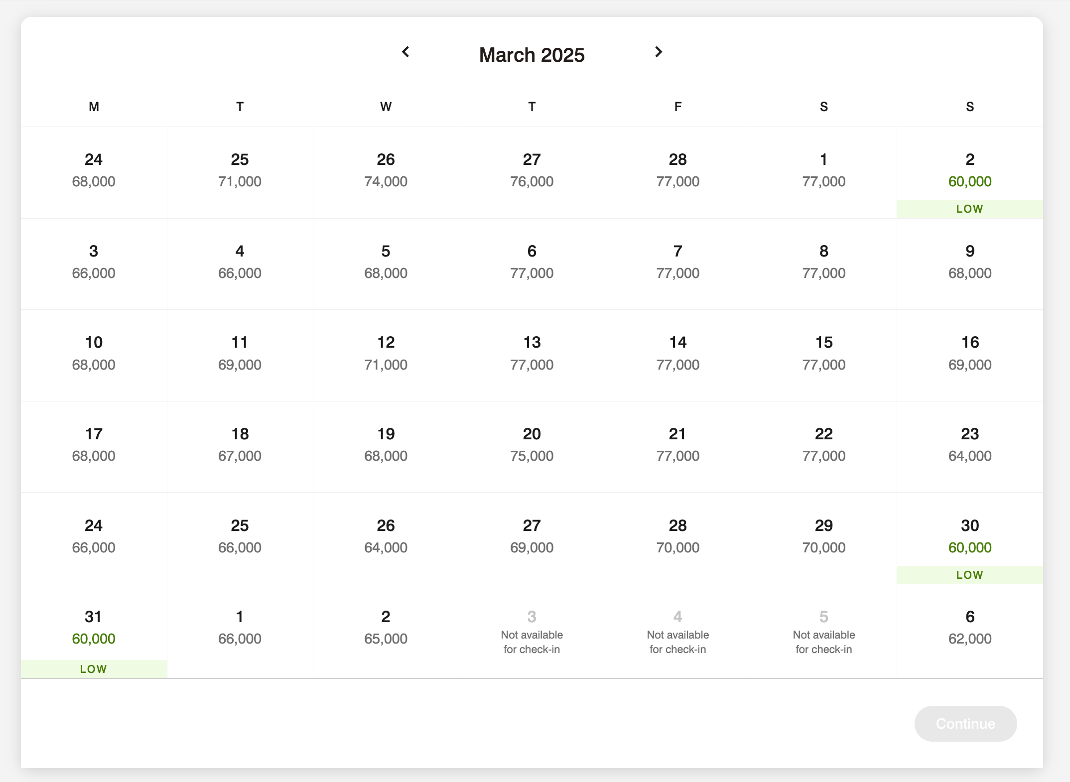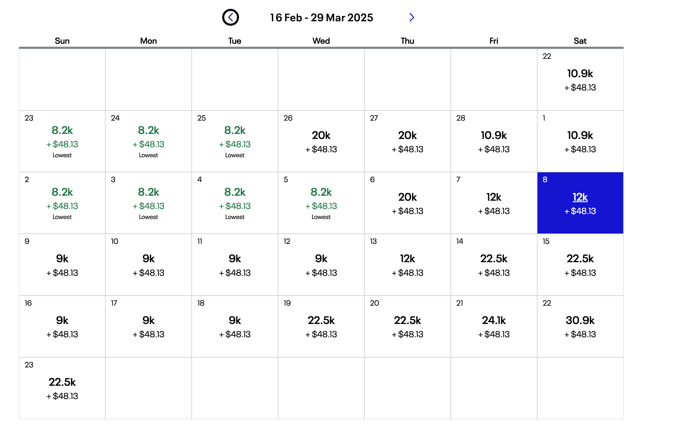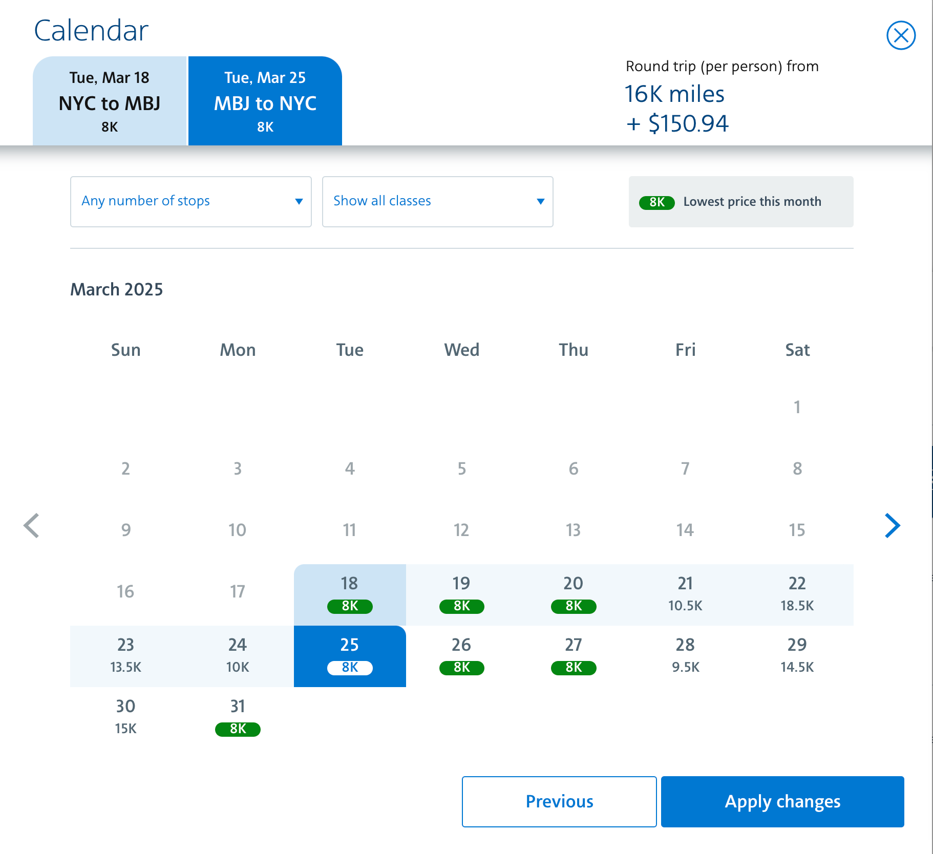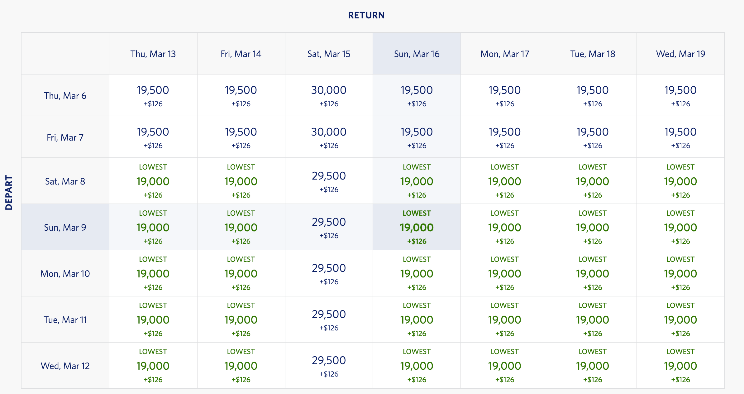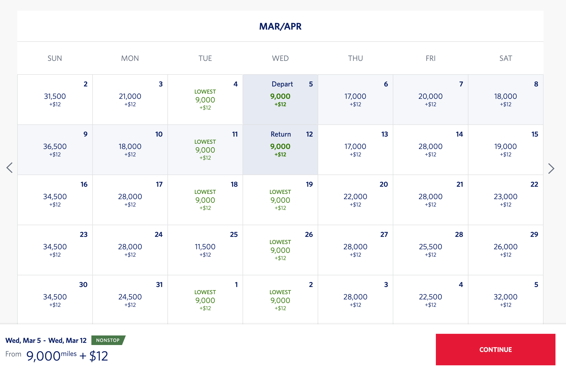 Delta prices its awards more dynamically. The lowest fares out of New York's John F. Kennedy International Airport (JFK) in March and April start at just 9,000 SkyMiles round-trip, which is a terrific deal but can cost four times this on other dates.