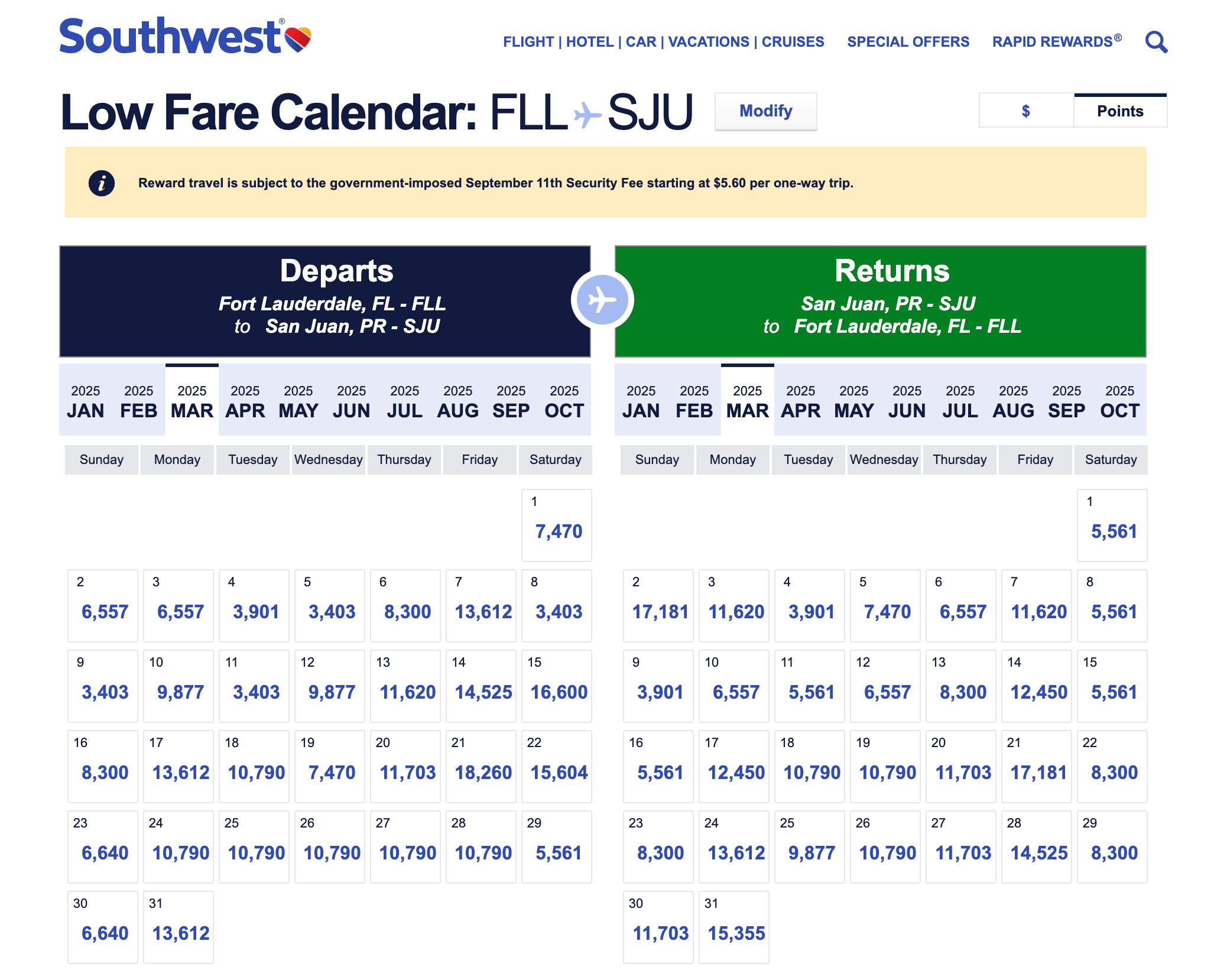 Cash fares between the U.S. mainland and San Juan are fairly low, so you'll likely get the best deal by booking your award with an airline that uses a dynamic award pricing scheme tied to the price of a cash fare like Delta, JetBlue or Southwest Airlines.