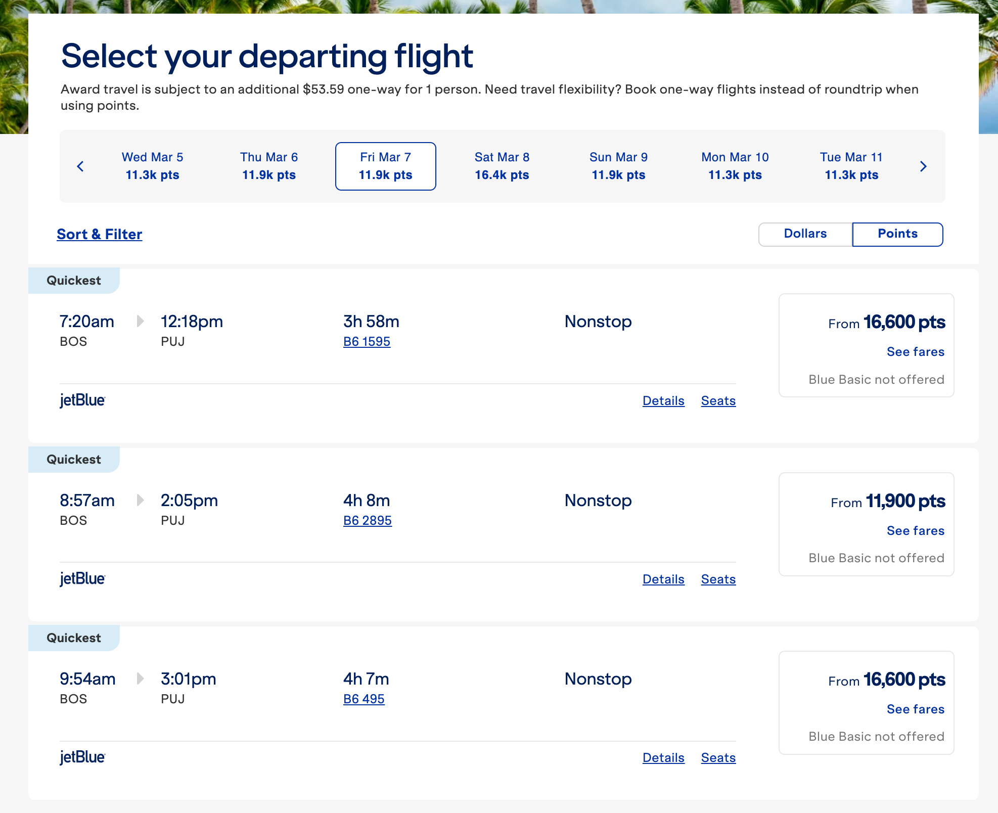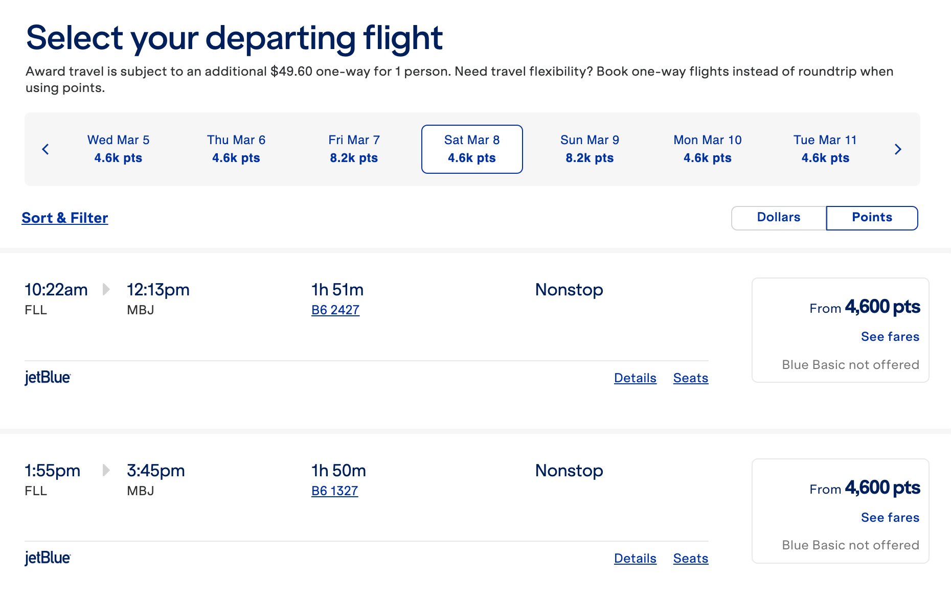 Depending on your departure city and dates, you may be able to book your flight with JetBlue for under 5,000 TrueBlue points one-way.