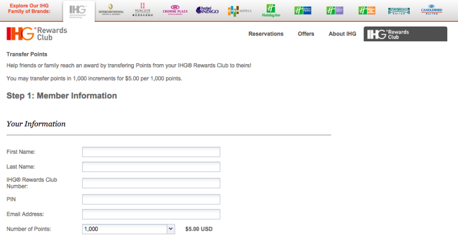IHG: Intercontinental Hotel Group charges a flat rate of $5 per 1,000 points transferred. There's a maximum of 50,000 points per transaction, which translates to a cost of $250 for a free night at a top level IHG property. I wouldn't recommend this in general, but it's a helpful option to have if you just need a few thousand points to top off an account for a specific redemption.