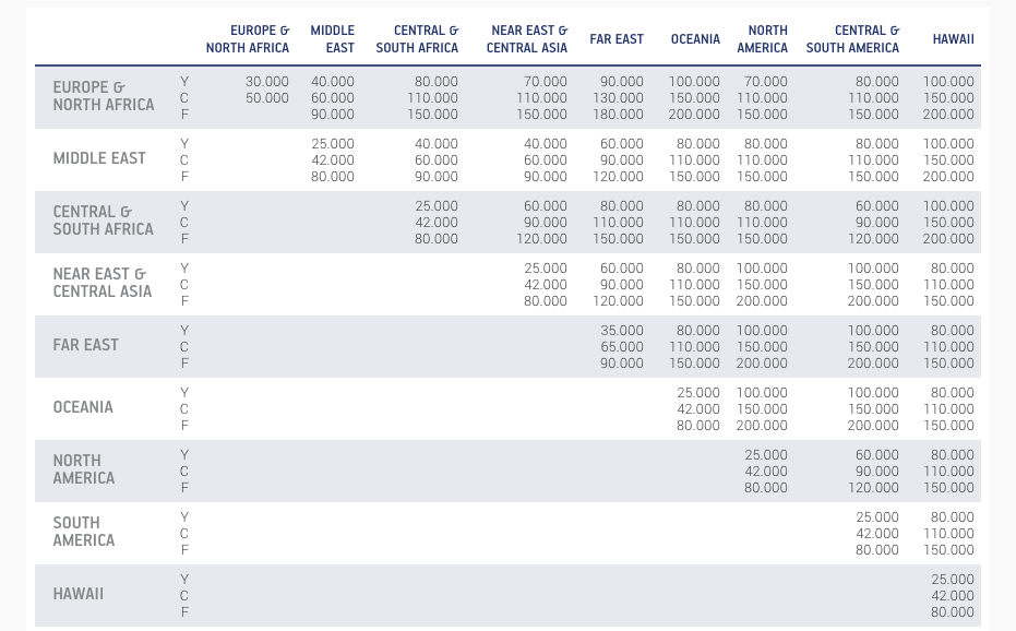 Booking awards: Miles & More basics are laid out in this post, but the key things to keep in mind are that you can only have two stopovers and two open jaws on round-trip awards, that you can score deals like 30,000-mile economy awards between select cities in the U.S. and Europe, and that its award chart is not the best deal overall, but there are some interesting redemptions like North America to Hawaii for 40,000 miles round-trip in economy, domestic business- and first-class awards for 30,000/40,000 miles respectively, and business class to Central and Southeast Asia as well as Australia/New Zealand for 142,000 miles. The program does add fuel surcharges to some awards, so beware of high prices.