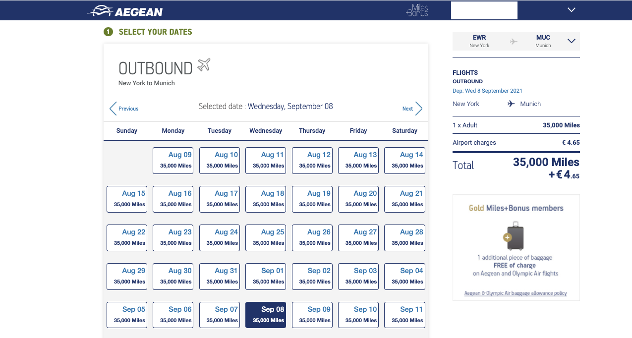 Before you try to book Star Alliance awards through the Aegean website, you need a Miles + Bonus account. Log in and then go to the Miles + Bonus tab and click "Spend Miles." From there, you should see an option for "Flights" down at the bottom of the page, which should take you to a booking page. Then enter your search criteria, including cities, dates, and class of service, and you should find results pulled up in calendar form.