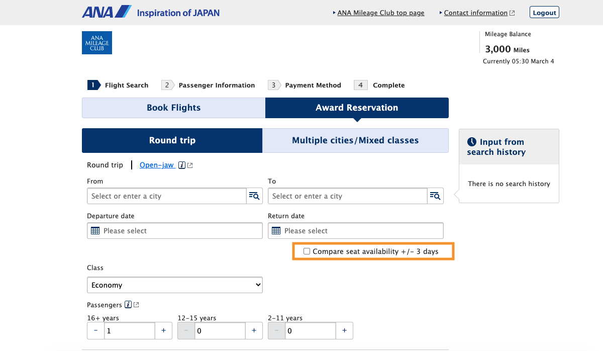 That should bring up the following page, on which you can enter the particulars of your trip, including the class of service you're searching for. Definitely click on "Compare seat availability +/- 3 days" to improve your odds.