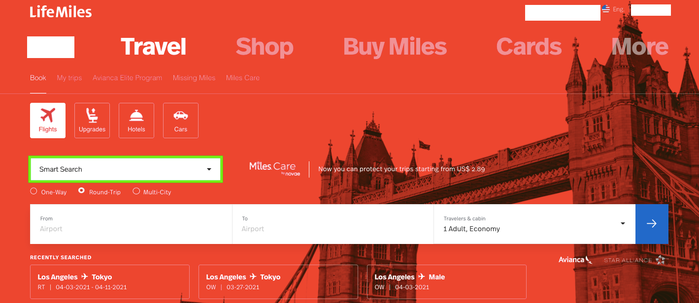 Booking awards: To search for awards, log into your account and then click "Fly." That should bring you to the search page, and if you've got a specific airline in mind, you can choose Avianca, Star Alliance, or individual carriers from the "Smart Search" dropdown.