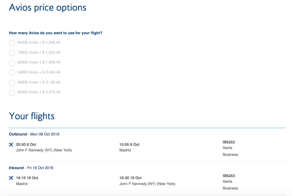 You'll find the most significant savings for flights on Iberia or Aer Lingus metal, but there is a small discount for flights operated by British Airways as well. Take the below example of a round-trip business-class award from New York-JFK to Madrid (MAD). British Airways would charge you a reasonable 84,000 Avios but then add over $1,000 in taxes, fees and surcharges!
