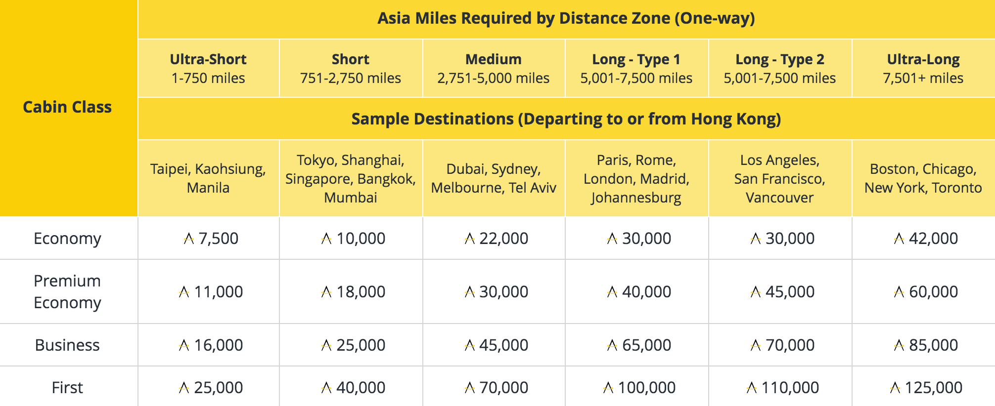 All awards are priced as one-way, meaning that a round-trip simply costs double the miles. Here are the prices for flights operated by Cathay Pacific and Cathay Dragon.