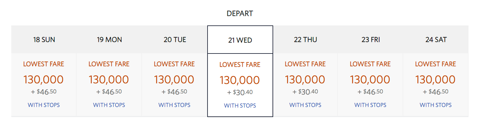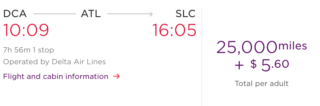 As a result, these great award rates are generally only applicable to nonstop flights. That's why this one-stop routing from Washington-Reagan (DCA) to Salt Lake City (SLC) via Atlanta costs a full 25,000 miles: