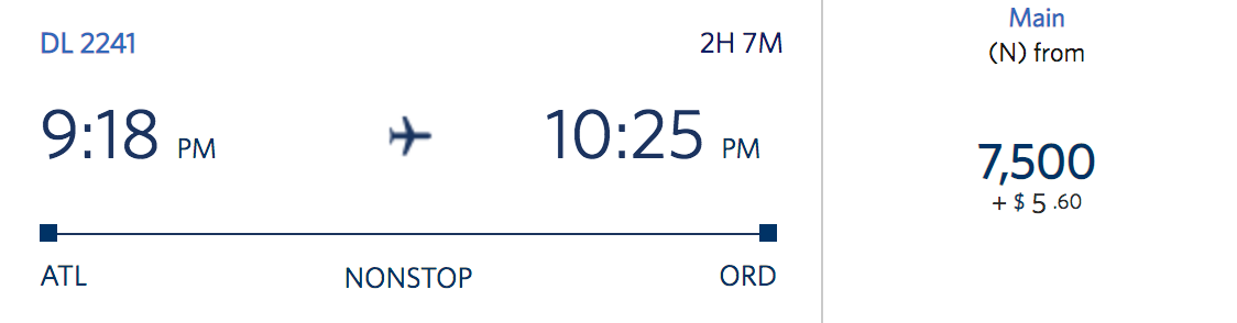 It's not all bad though, as many domestic flights on Delta start at much lower rates than the "standard" 12,500-mile level. Here's an example of a one-way flight from Atlanta to Chicago (ORD) for just 7,500 miles: