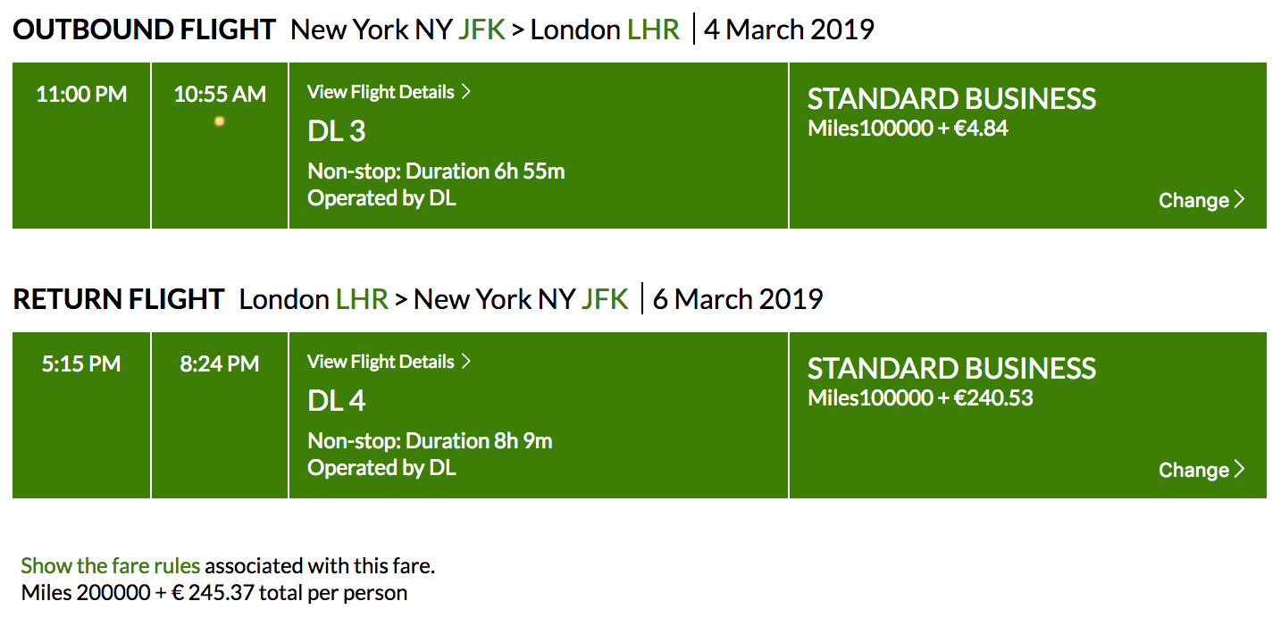 However, when I went to make a dummy booking from New York-JFK to London-Heathrow (LHR) on a nonstop Delta flight in both directions, I was quoted 200,000 miles and over $250 in taxes: