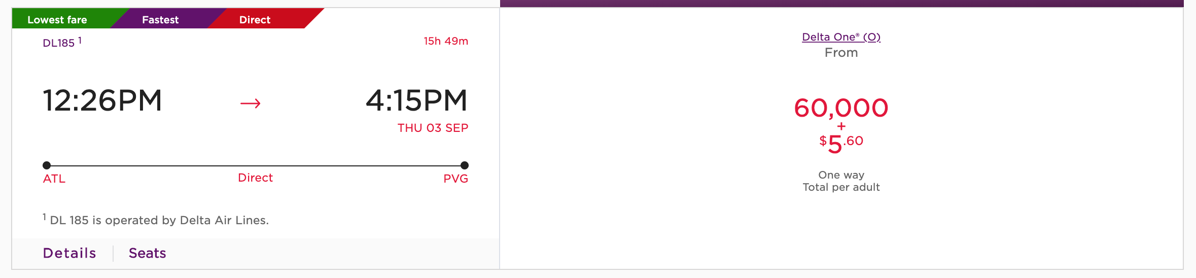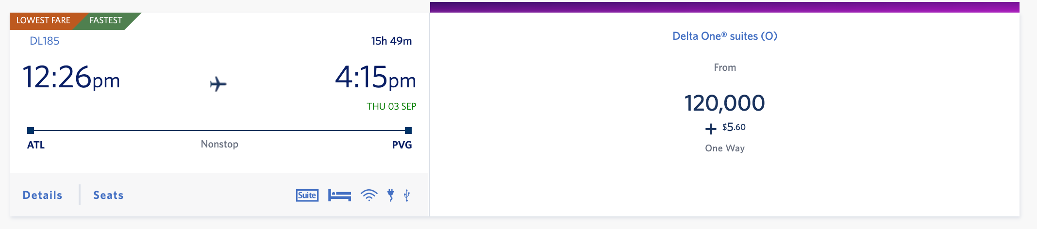 Take the below example of an August flight from Atlanta to Shanghai (PVG) in Delta's flagship Delta One Suites. Booking this award through Delta would cost you 120,000 Skymiles: