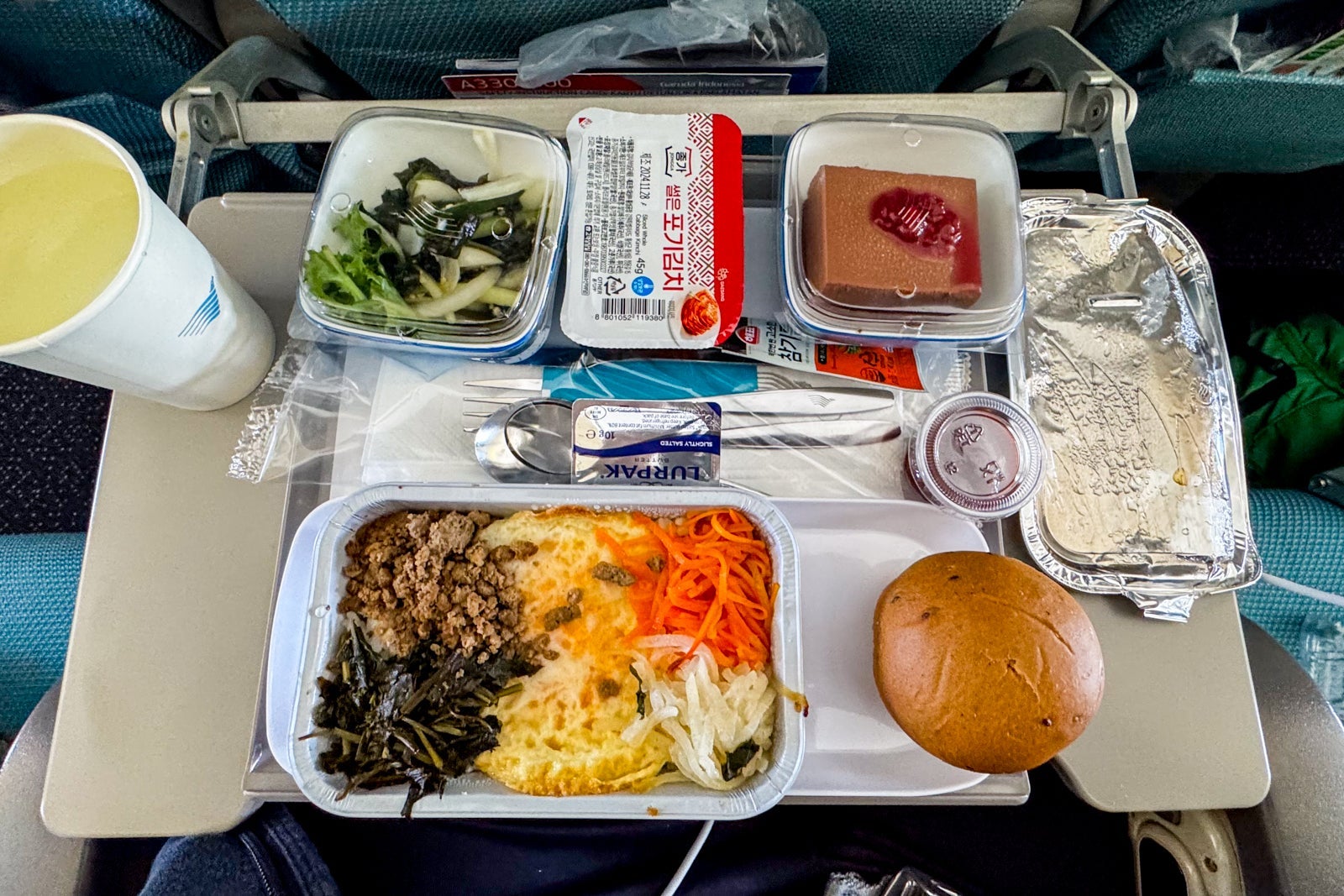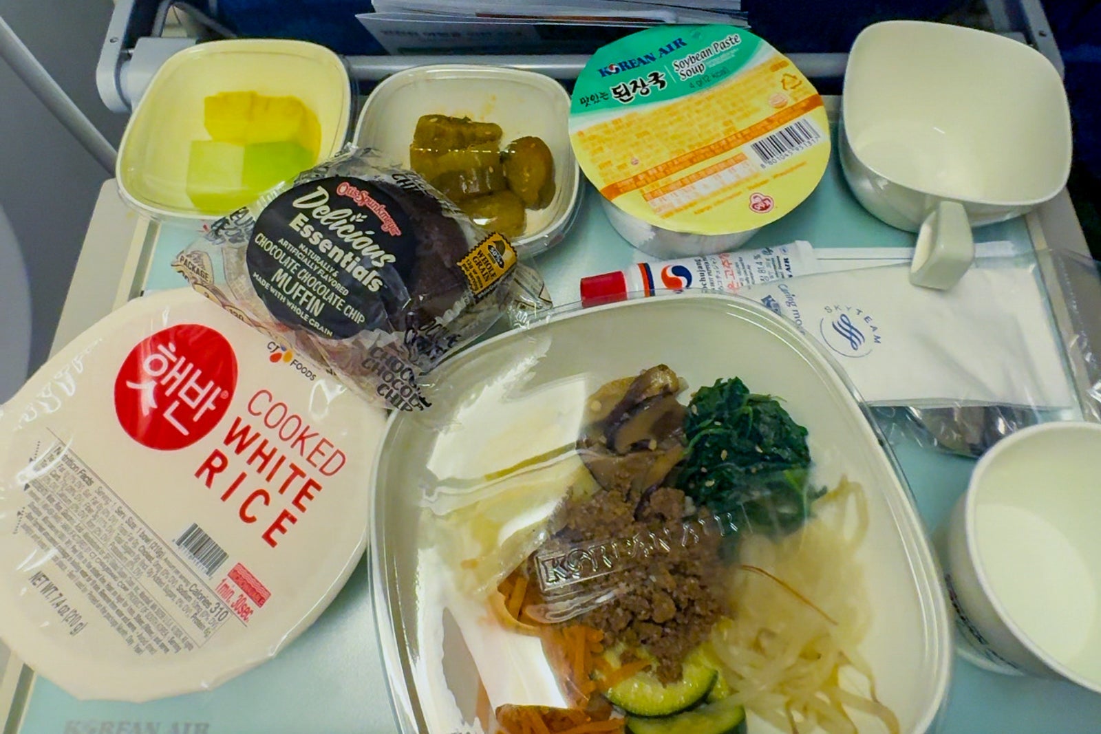 My favorite part of the flight was the food. My first meal was a Korean staple, bibimbap. It was quite tasty and, dare I say, even rivaled some versions I have had on land, though the portion was small.