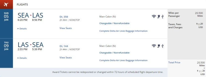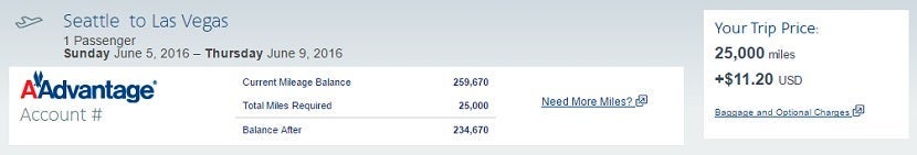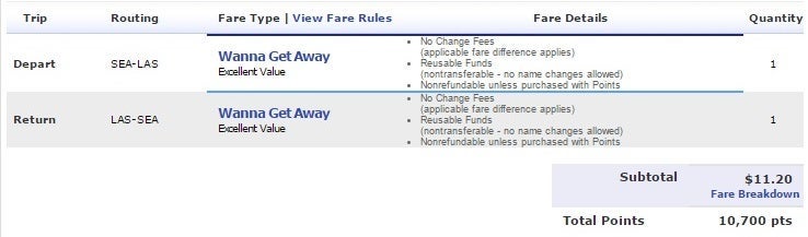You won't have that problem when redeeming Rapid Rewards points, since the cash price and award price are connected. For example, consider a round-trip flight from Seattle to Las Vegas on June 5-9. At the time of writing, Southwest was offering a nonstop evening departure and afternoon return for 10,700 points (plus $11.20 for security fees). If you paid cash, that same flight would cost you about $188.