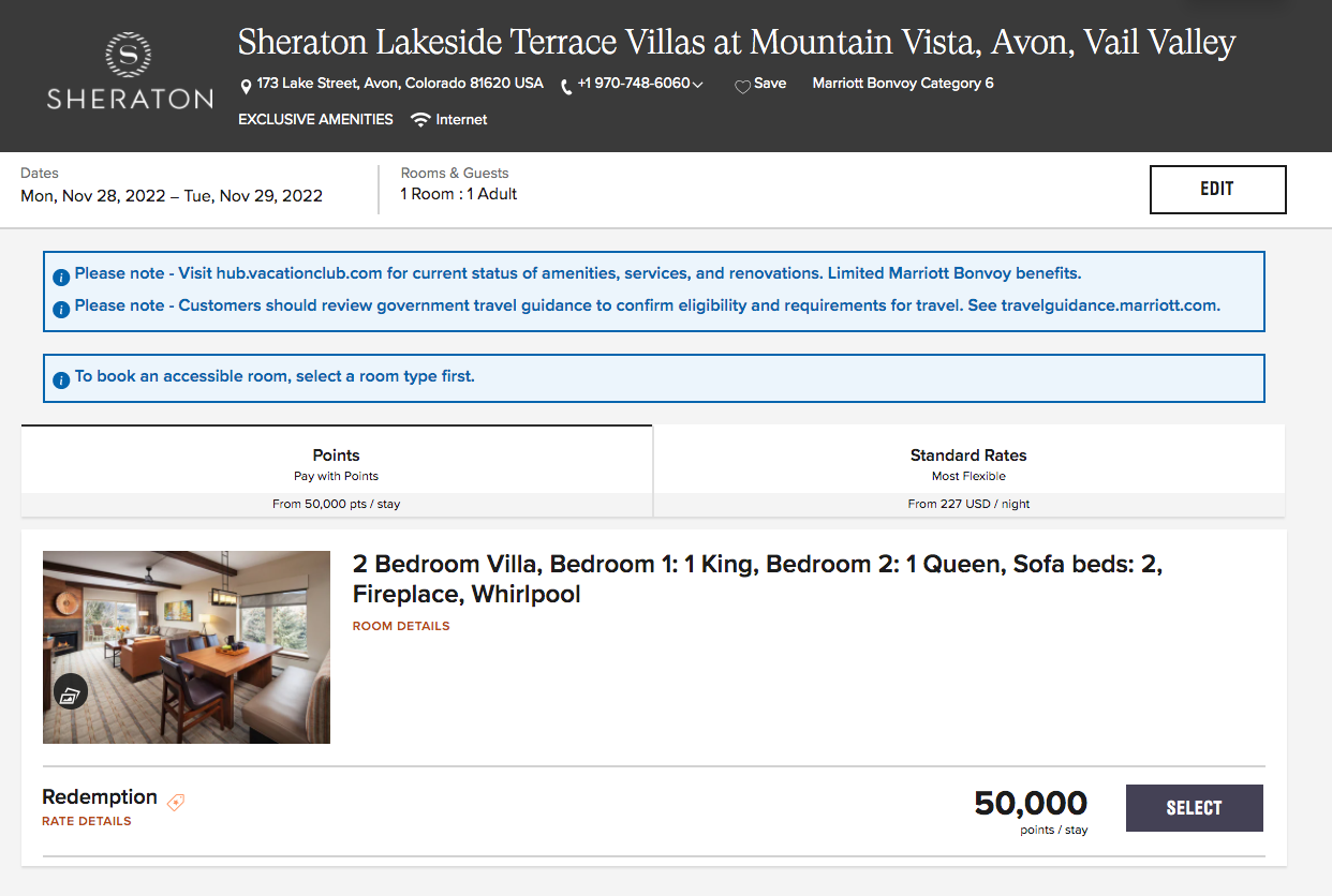 Since Sheraton Lakeside Terrace Villas is a Marriott Vacation Club property, there are limited Marriott benefits for those who have status. But unlike most Vacation Club properties, it's easy to book a room on points (requiring between 40,000 to 60,000 points per night). During standard or off-peak dates, you can even use a 50,000-point free night award certificate that comes with the Marriott Bonvoy Brilliant® American Express Card®.
