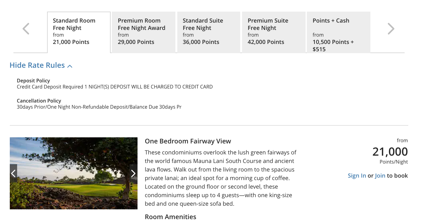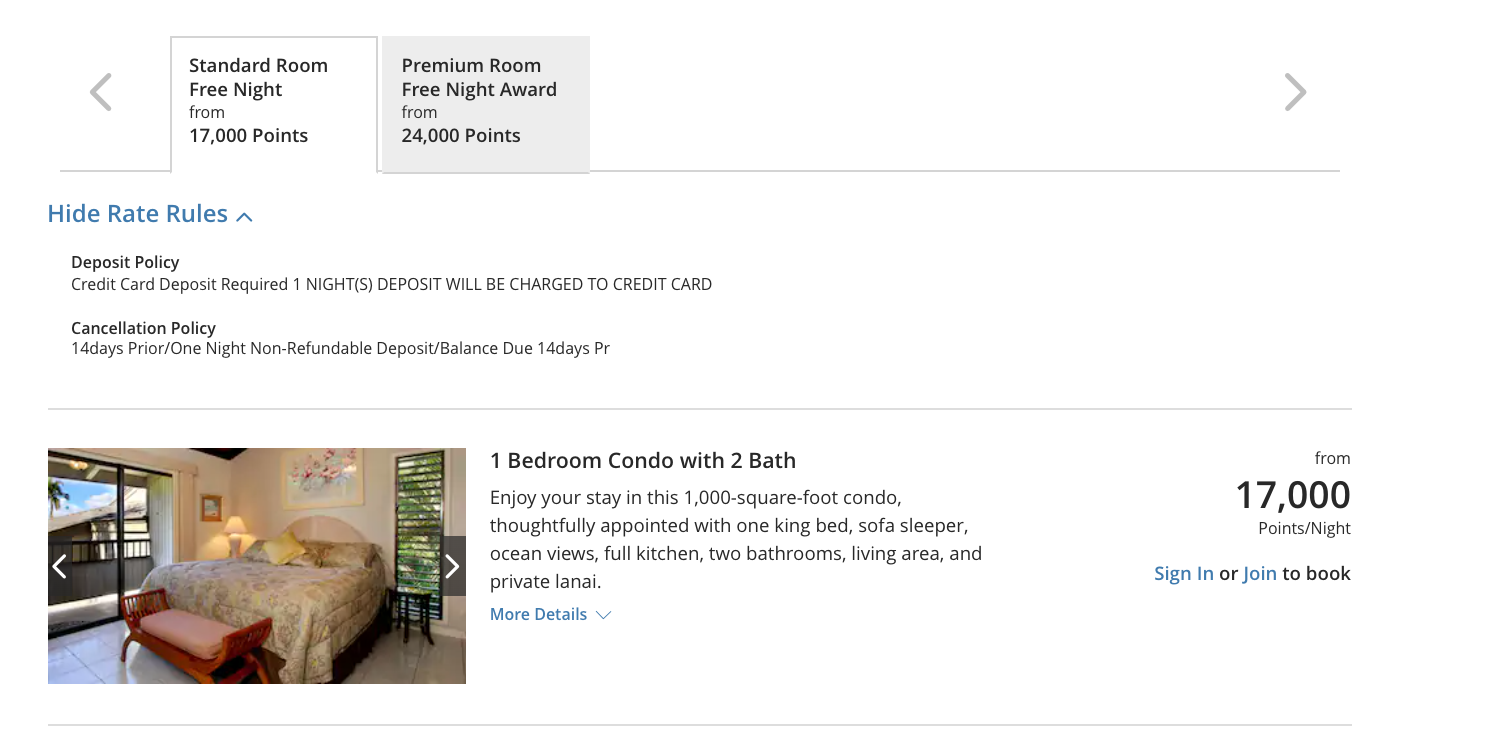 This property on The Big Island lets you use the standard number of points -- between 21,000 and 29,000 World of Hyatt points per night -- for a one-bedroom condo. Unfortunately though, similar to many other Destination by Hyatt Residence properties, you won't receive the same World of Hyatt status benefits, like complimentary upgrades or breakfast for Globalist members.