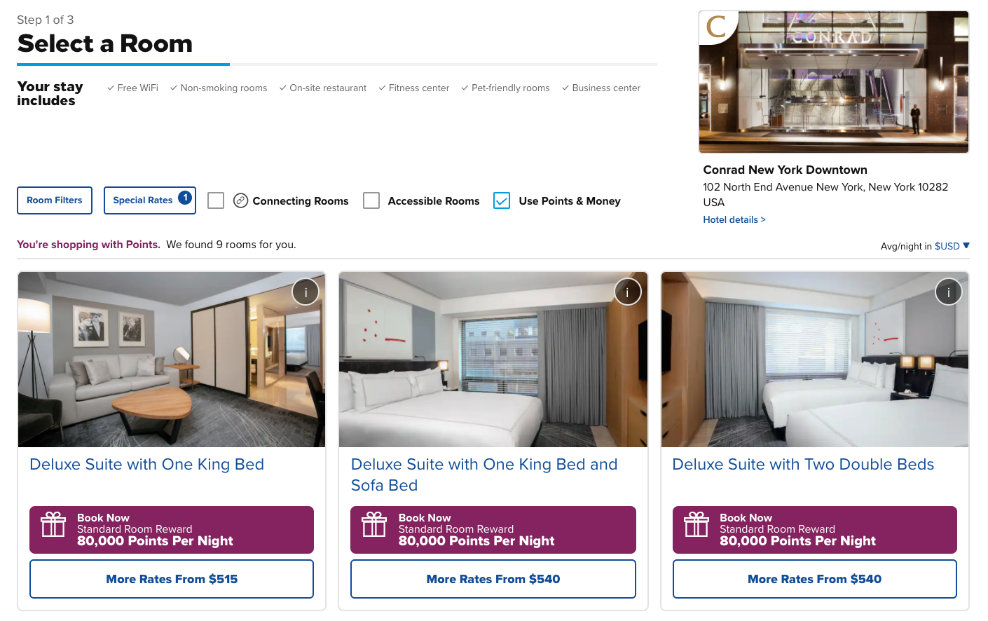 Large(ish) rooms are hard to come by in New York City. However, you can redeem 80,000 Hilton Honors points per night at the Conrad New York Downtown and stay in a one-bedroom suite. It includes a fully separate bedroom and living room, and features either two double beds or one king bed, and a sofa bed. If you have Hilton Honors status -- which you'll automatically receive with one of Hilton's co-branded credit cards, even the no-annual fee Hilton Honors American Express Card (see rates & fees) -- you'll receive your fifth night free.
