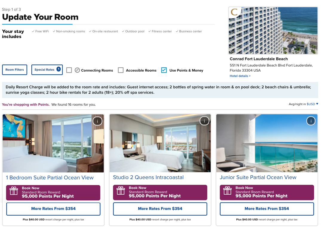 Conrad Fort Lauderdale Beach charges a $40 resort fee, which includes two beach chairs and an umbrella, morning yoga and the use of bikes. However, all resort fees are waived when you use points at a Hilton property. This means you'll receive the exact same amenities at no extra cost, simply by using your points.