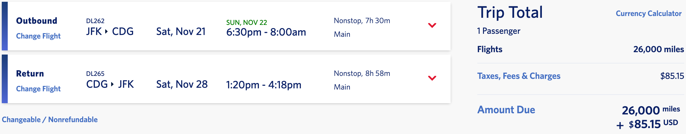 But you're likely to get better value if you're searching for flights to Europe. We're seeing deals for Thanksgiving dates to Paris (CDG) nonstop from New York-JFK for just 26,000 SkyMiles, plus $85, round-trip.