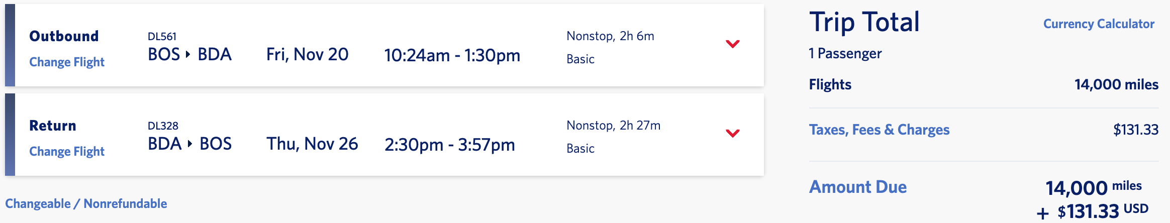 You may, however, be able to find some good award availability now. For instance, you can currently book a round-trip, nonstop ticket from Boston (BOS) to Bermuda (BDA) for just 14,000 SkyMiles. (What Bostonian would complain about trading in November in New England for November on a beach in Bermuda?)