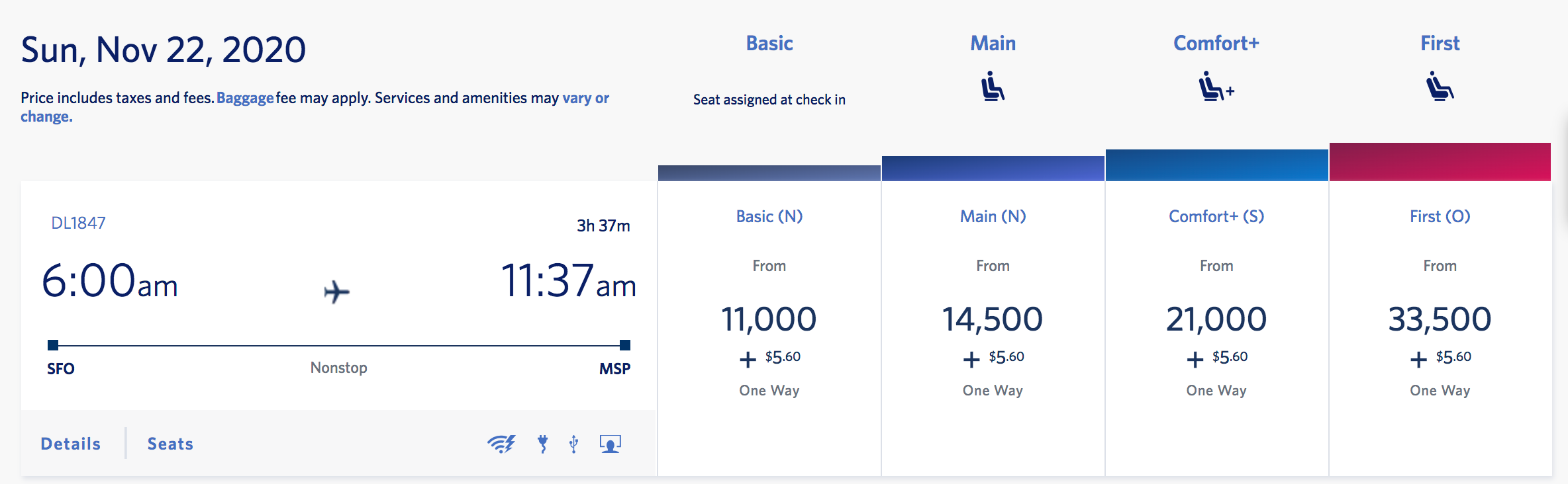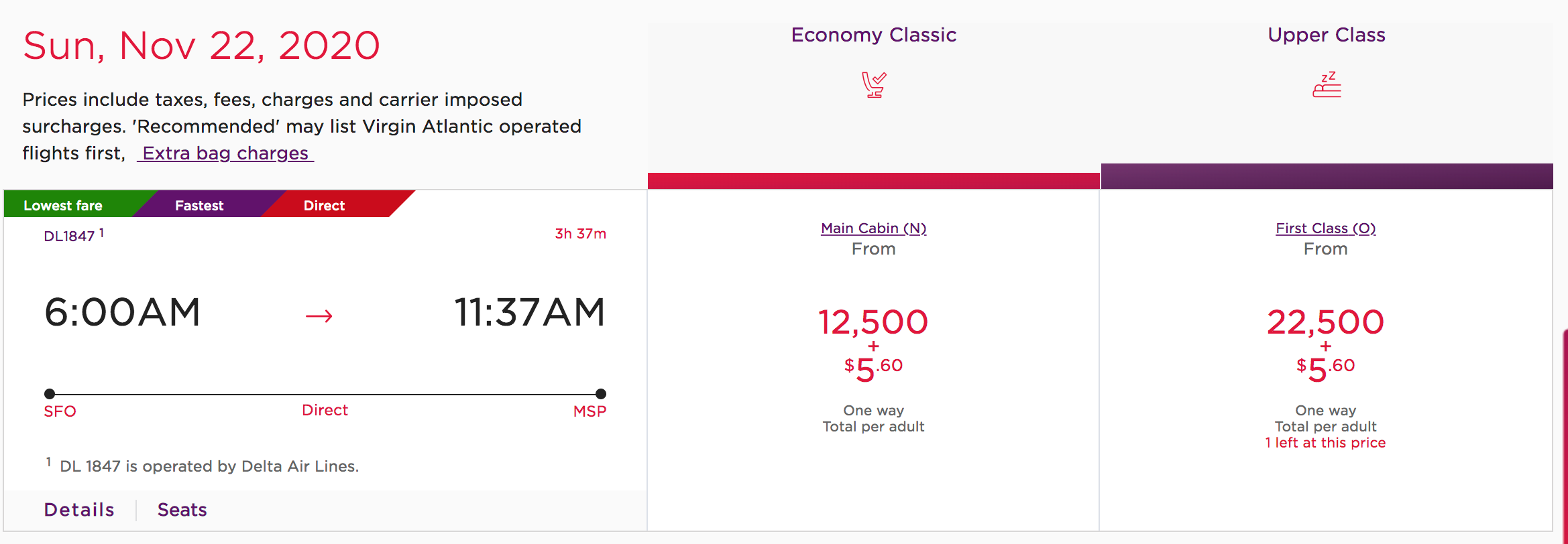 You'll see the same flight in the two screenshots above, one from Delta and the other from Virgin. The Delta flight starts at 11,000 SkyMiles one-way, but if you look closer you'll see that it's in basic economy. The flight booked through Virgin starts at 12,500 miles in Main Cabin. There's also a difference in economy pricing, so if you're looking for domestic flights on Delta, you may want to start with Virgin Atlantic Flying Club.