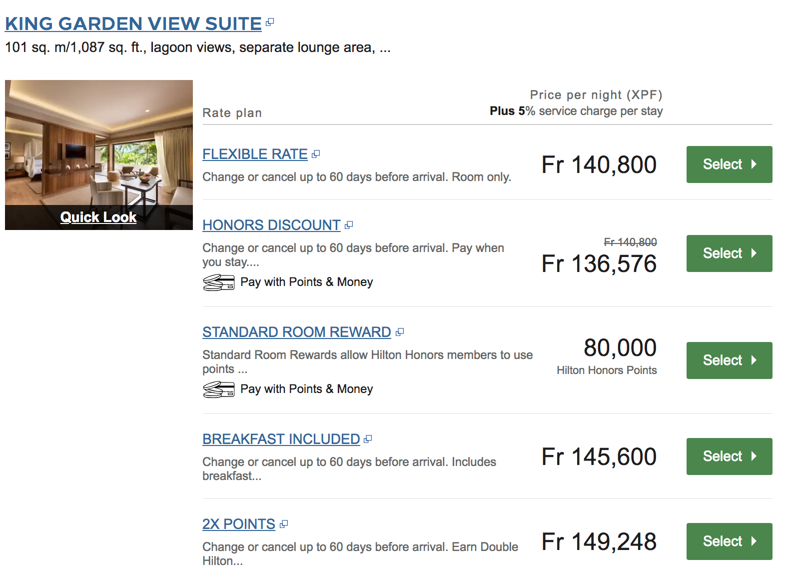 That 80k Hilton number looks similar to the 85k Marriott number, but keep in mind that a Marriott point is valued significantly higher than a Hilton point. Currently, TPG values Marriott points at 0.8 cents each and Hilton points at 0.6 cents each. Cash rates at both properties are similar for our dates at a little under or over $1,000 per night, depending on how you book. (Which is well over what I'd want to spend with cash.)