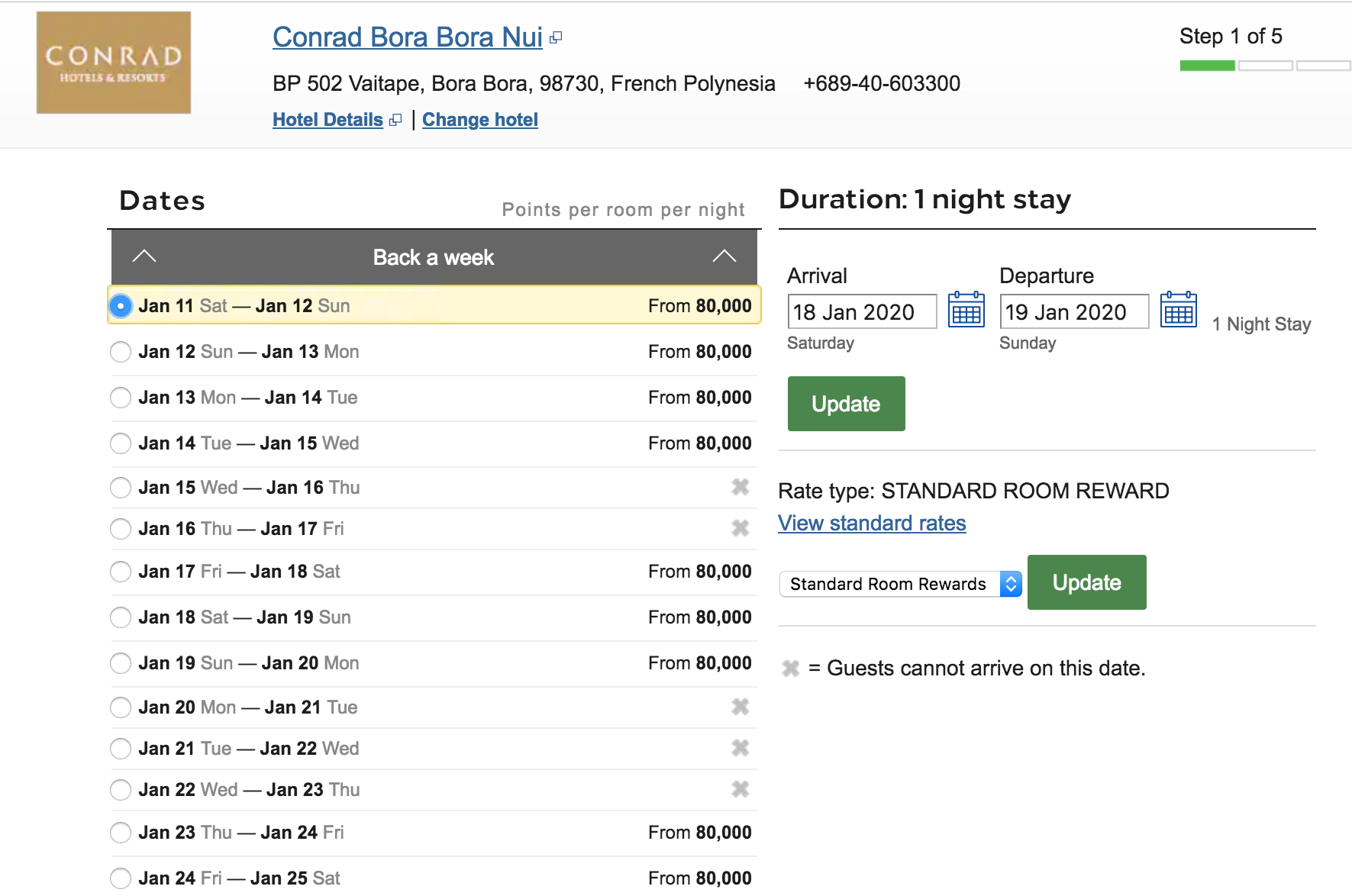 Note that the Conrad Bora Bora did not have 80k award availability when we first started considering Bora Bora as a destination, but as is often reported on the related thread Conrad Bora Bora on Flyertalk, standard award availability frequently becomes available at this resort if you pay attention and keep checking. Use Hilton's flexible date search to quickly spot when 80k availability is and isn't available.