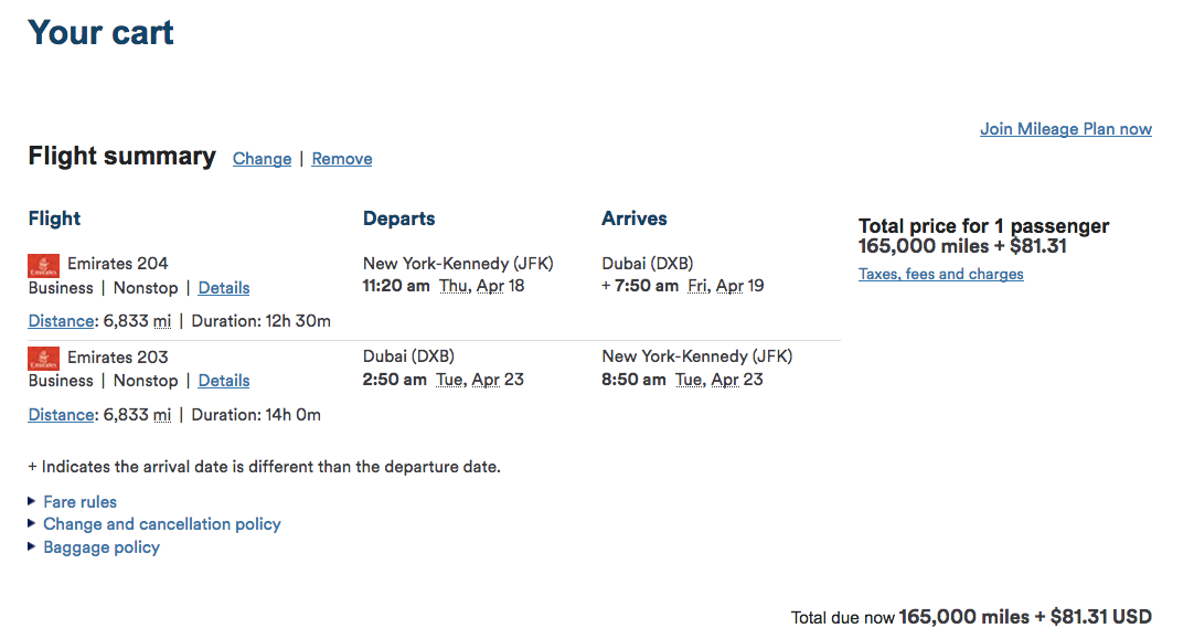 As with economy awards, your options are basically Alaska Mileage Plan, JAL Mileage Bank and Emirates Skywards. If you're traveling from the US to Dubai, Alaska charges 82,500 miles each way after its unannounced (and massive) devaluation back in 2016, and you'll also need to cough up about $81 in taxes/fees. Unfortunately, the options for tacking on flights to Asia or Africa are not really bargains in this case, as they'll cost you an additional 22,500 and 37,500 miles each way, respectively.