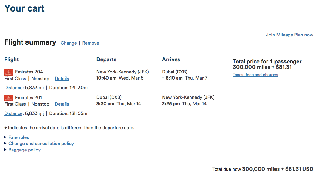 As noted above, Alaska devalued its Emirates award chart in early 2016, and first class took the brunt of it. Even though the prices are no longer fantastic, you'll still lock-in an incredible experience and save significant cash on the taxes and fees when compared to booking with Emirates. The program also regularly runs bonuses on purchasing miles, so this might still be an option. You'll need to fork over 150,000 miles each way (300,000 miles round-trip) for flights from the US to the Middle East, though taxes and fees are a very manageable $81. You could also consider tacking on another leg to Asia for just 30,000 more miles in each direction.