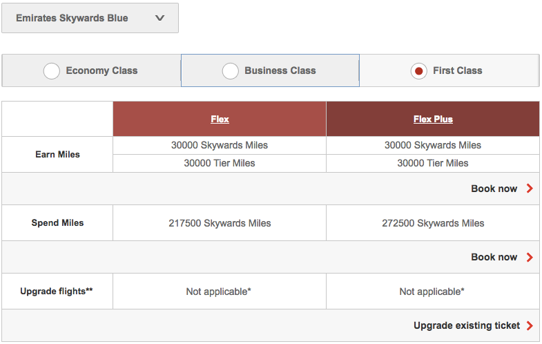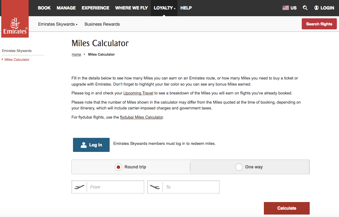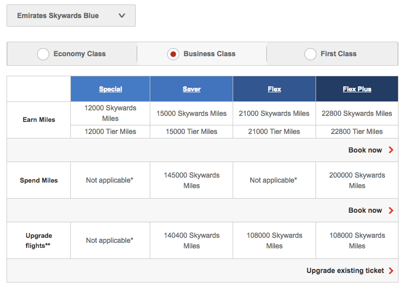 The third and final way to redeem miles for Emirates flights is through its own Skywards mileage program. Skywards is an American Express transfer partner, and you can even use these miles to book FlyDubai tickets as well if you're coming from one of that carrier's destinations. For now, let's just focus on Emirates' own flights. Unfortunately, due to the mileage values and taxes/fees, Skywards awards aren't your best option.