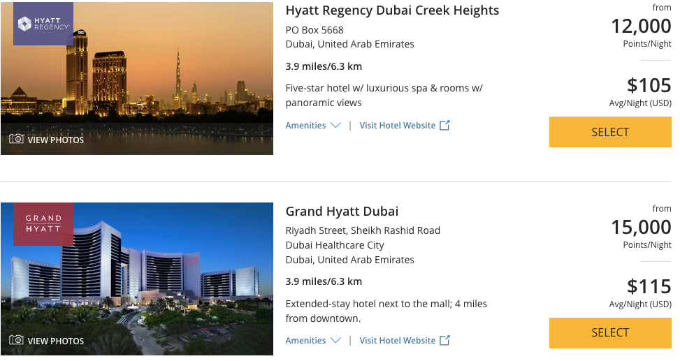 World of Hyatt members can redeem 12,000 points to stay at the Hyatt Regency Dubai and the Hyatt Regency Dubai Creek Heights or "splurge" by using 15,000 points per night at the Grand Hyatt Dubai. All three of these properties would also be great uses of Hyatt's free night certificates from the World of Hyatt card.