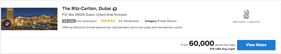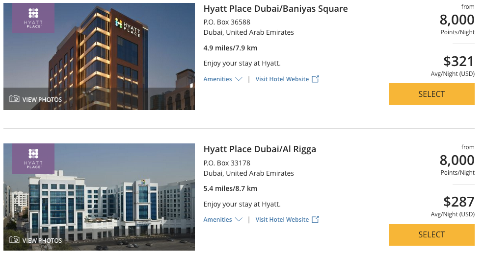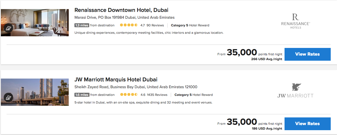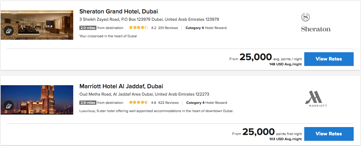 The Sheraton Grand Hotel, Dubai and the Marriott Hotel Al Jaddaf, Dubai are only 25,000 points per night.