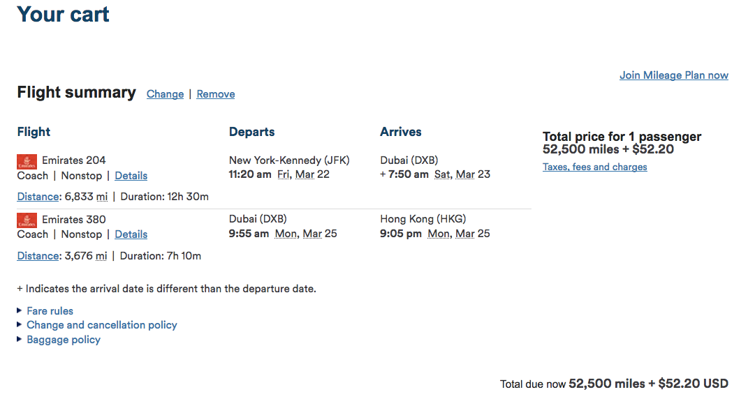 Feel like going to Asia instead? That's 10,000 miles more for a total of 52,500 each way plus minimal taxes and fees. Here's a sample award from New York-JFK to Hong Kong with a few days in Dubai as a stopover.