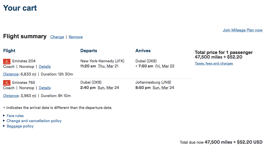That becomes an especially good deal when you consider that the airline charges just 47,500 miles each way in economy between the US and Africa, so you're essentially getting a few days in Dubai and an extra leg to your final destination for just 5,000 miles more. Plus, it's easy to book these online using the multi-city search option. Here's a sample award from New York-JFK to Dubai with a few days in the city and then continuing on to Johannesburg for just 47,500 miles and $52.20.