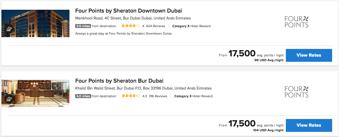 The Four Points by Sheraton Downtown Dubai and Four Points by Sheraton Bur Dubai are each only 17,500 points per night in the newly combined Marriott and SPG program.