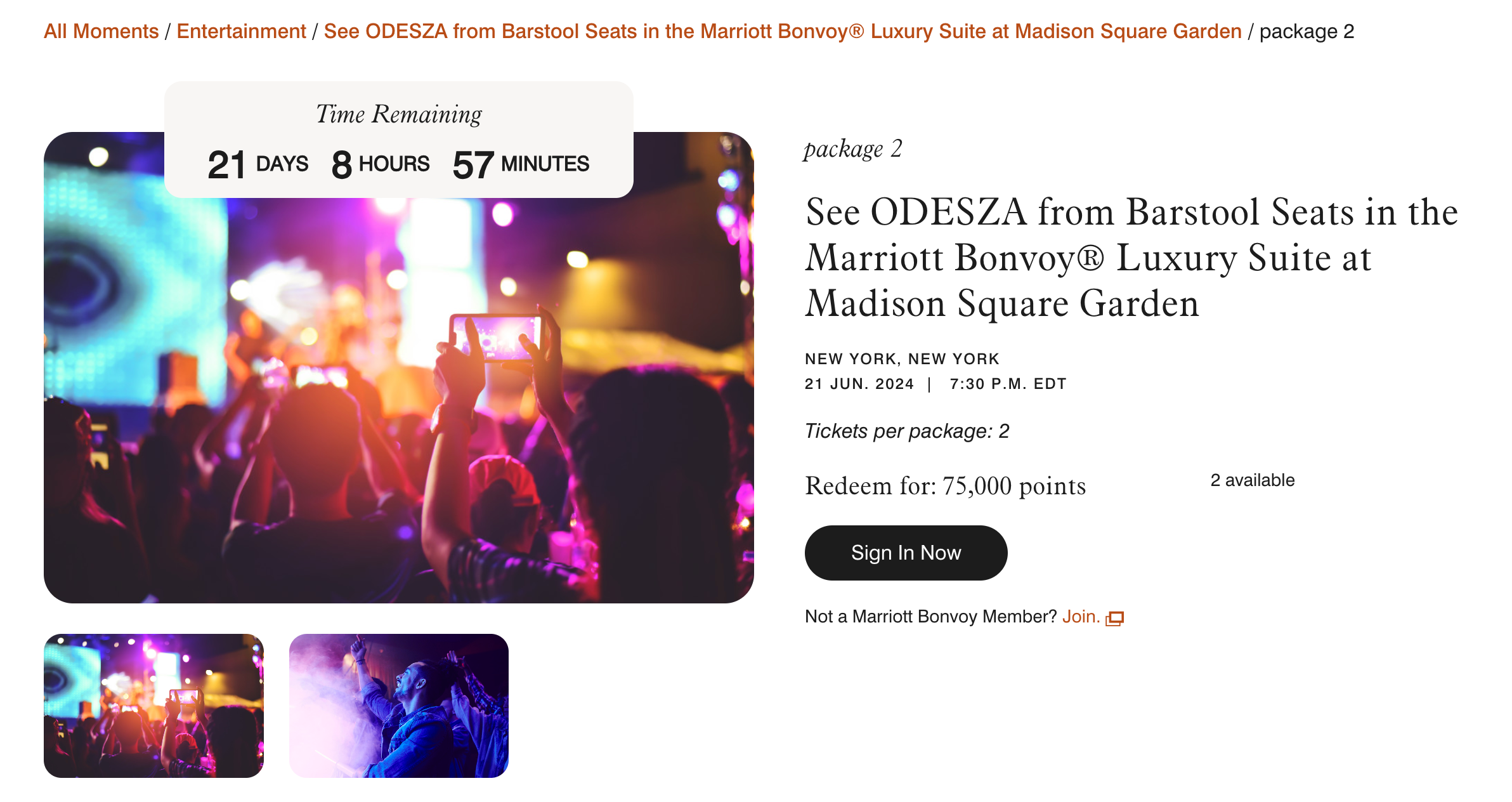 You could redeem 75,000 points to see Odesza from the Marriott Bonvoy Luxury Suite at New York's Madison Square Garden. TPG values 75,000 Marriott points at about $637, making this a good value if you are an Odesza fan.