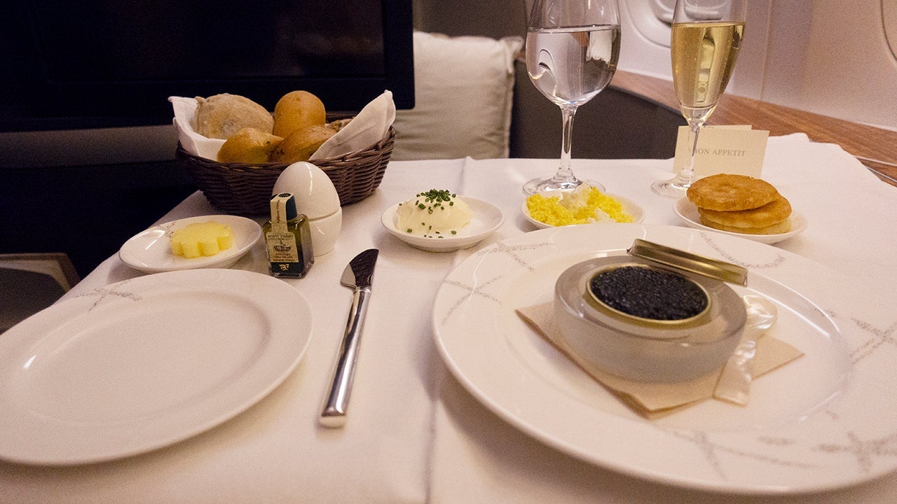And of course, it wouldn't be complete without caviar and champagne. Caviar snobs enthusiasts will be happy to know that Cathay provides proper mother-of-pearl spoons as well as a welcome card signed by the flight crew to accompany your dinner (you can just see it peeking out behind the champagne!).