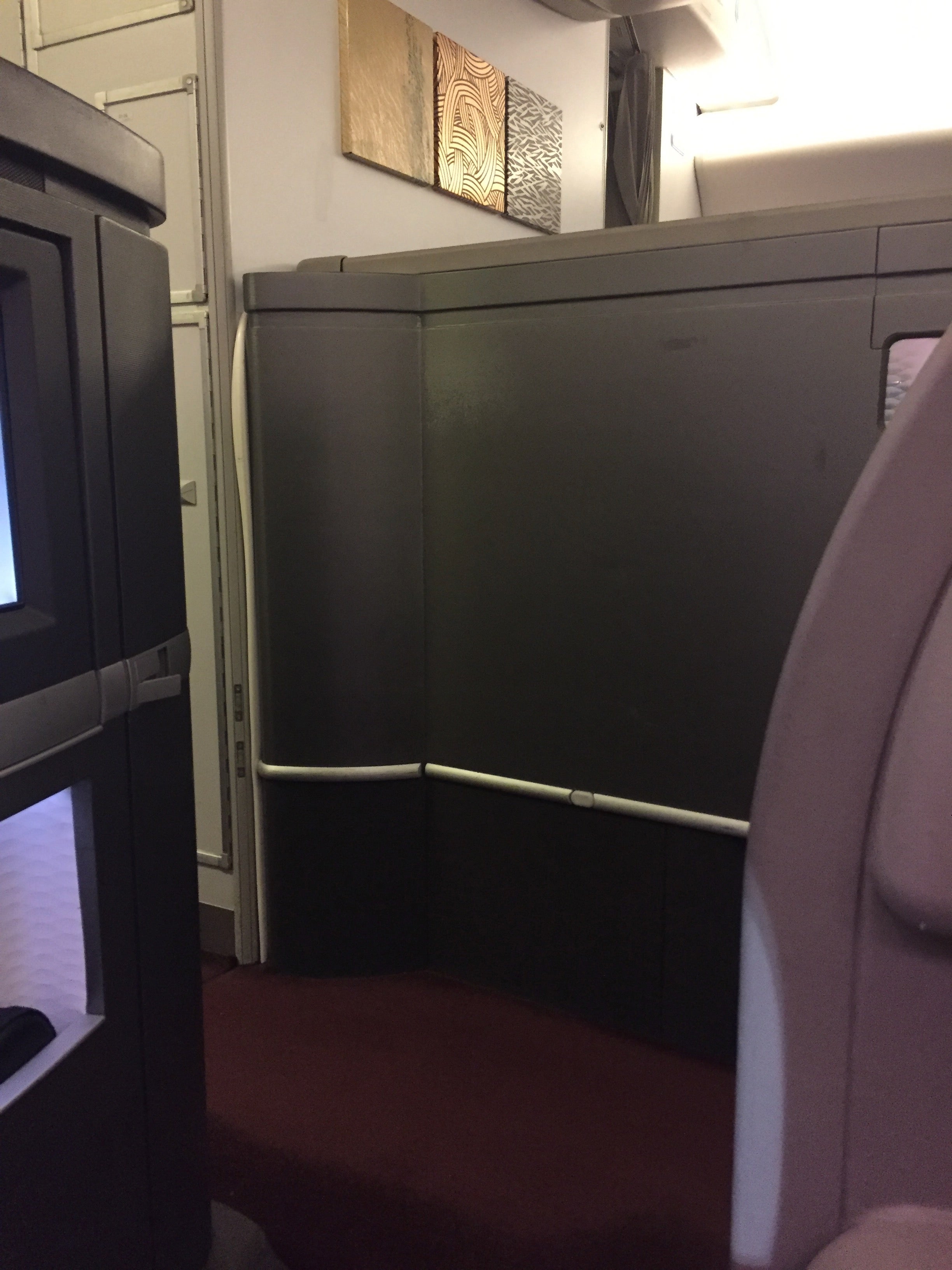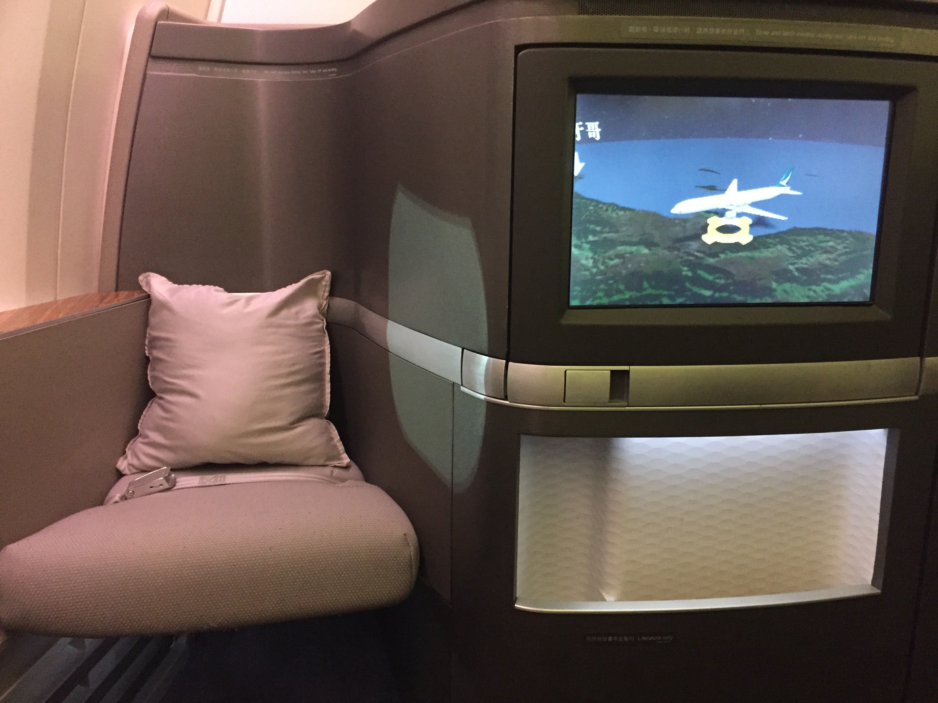 This means that seats on the the left side (1A and 2A) have an aisle to themselves. While Cathay doesn't offer fully enclosed suites with closing doors like some of its competitors, this configuration offers plenty of privacy. Here's the view from my time in seat 1A, and I swear I didn't see another passenger for the entire 15-hour flight.