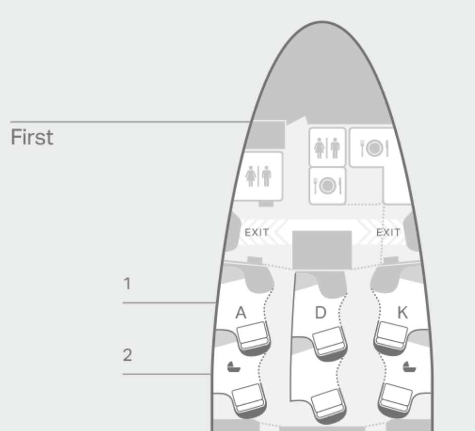 While there's no such thing as a bad seat in this cabin, there is one small quirk to be aware of. It's a little hard to tell just by looking at the seat map, but the middle seats (1D and 2D) are open to the right side of the plane and have a wall to the left.