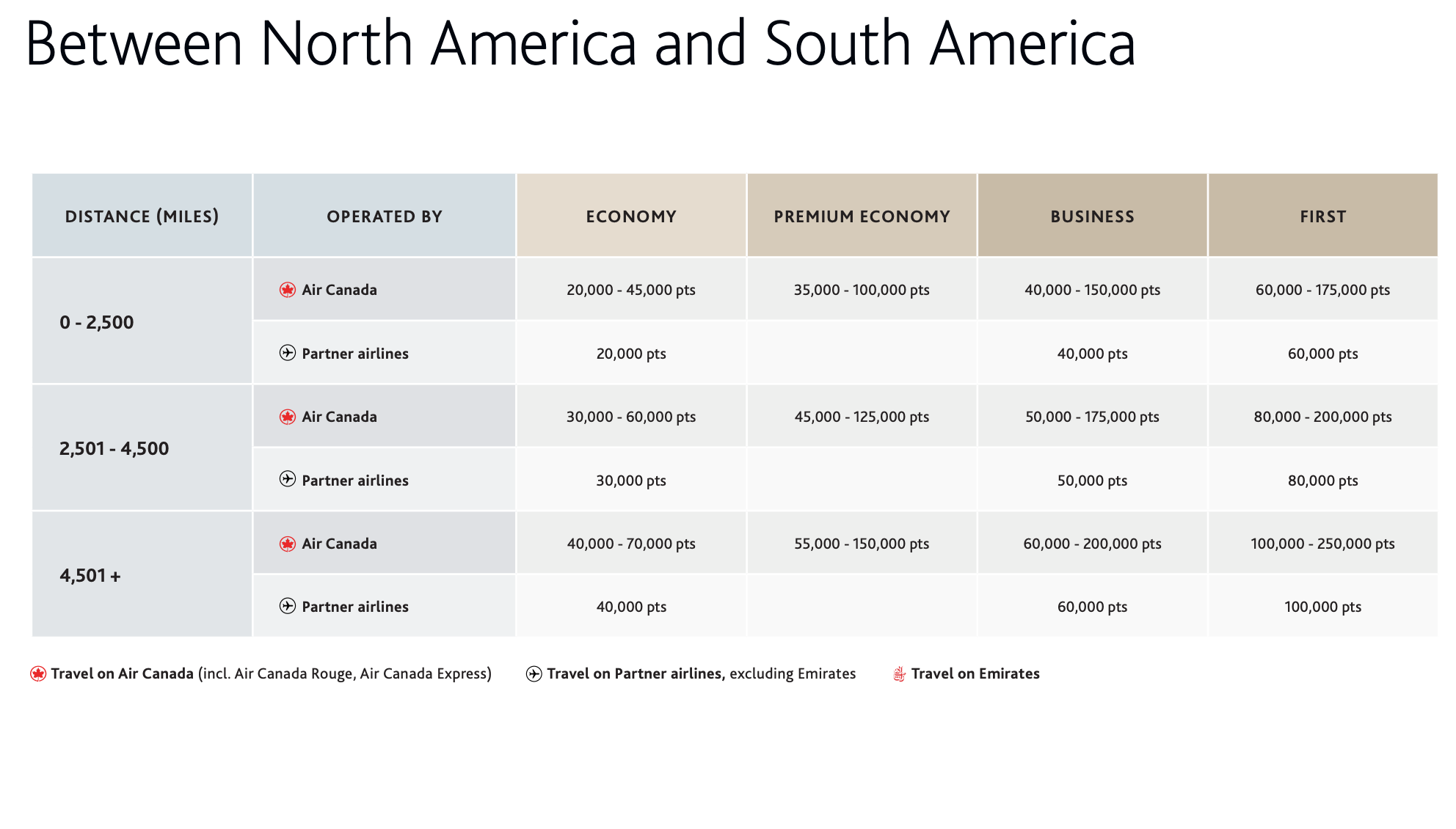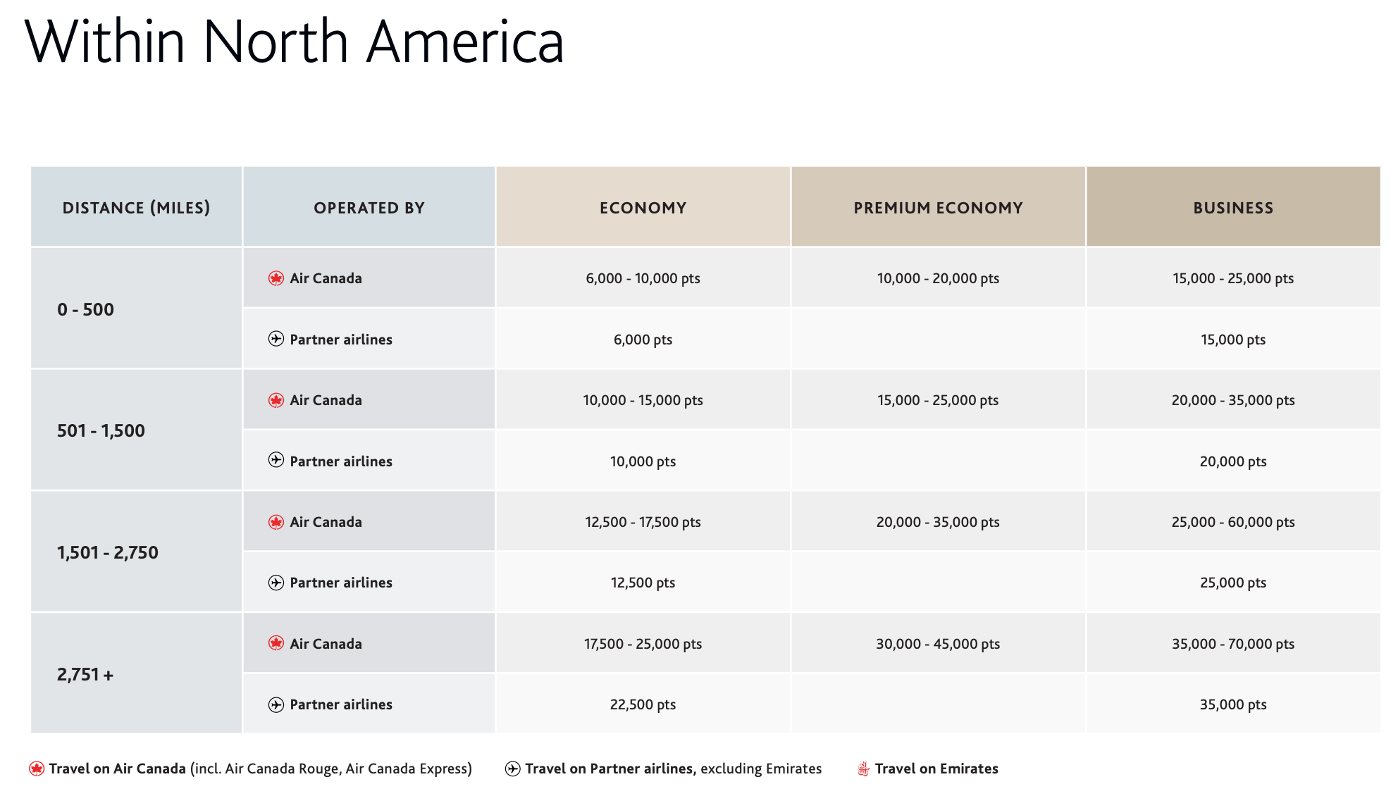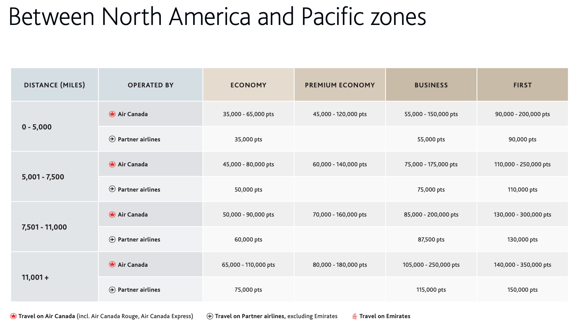 For flights operated by Air Canada, the pricing is dynamic, starting from 45,000/75,000 points for shorter journeys in economy/business, to 50,000/85,000 for longer journeys, with prices rising sharply depending on demand.