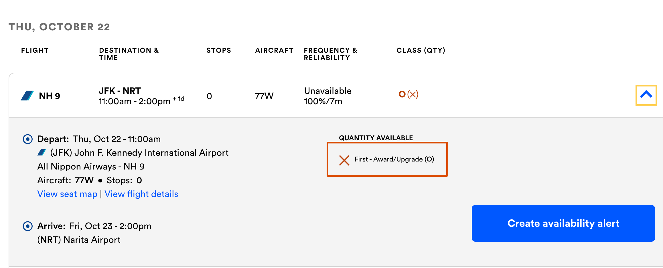 Next, you'll come across the search results. In this case, ANA flies one flight from New York to Tokyo on Oct. 22, 2020. However, there is no first-class award availability at the moment (highlighted in red).