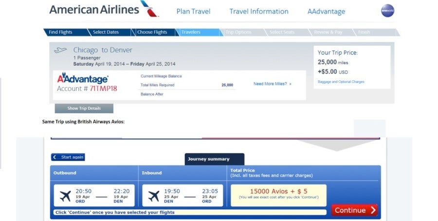 Using British Airways Avios (bottom) for short-haul flights on American (top) can save you miles.