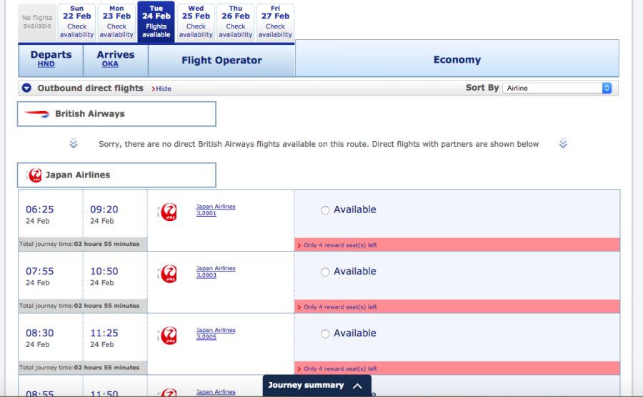 BritishAirways.com always shows plenty of Japan Airlines domestic flights available for Avios redemptions.
