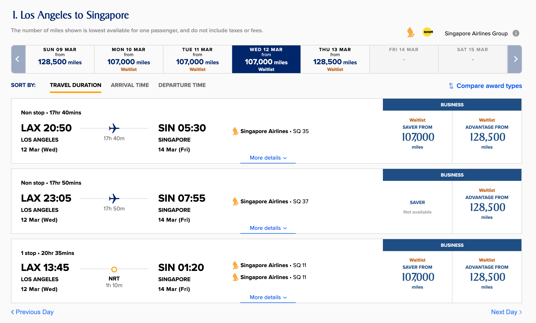 Here's an example of an option to travel from Los Angeles International Airport (LAX) to Singapore Changi Airport (SIN). In this case, Saver and Advantage awards are only available to request as a waitlist.