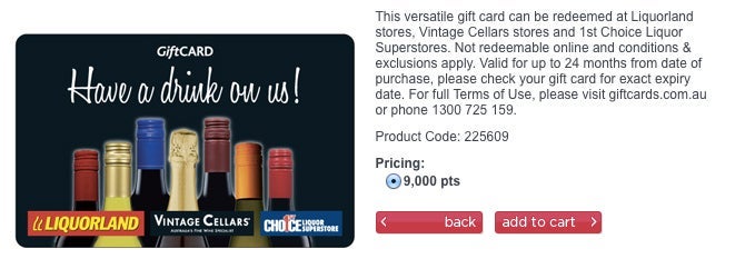 The Aussies have a reputation for enjoying their adult beverages, so perhaps it makes sense that Virgin Australia's Velocity frequent flyer program offers up gift certificates to the Coles Group chain store Liquorland. But with a value of just 0.55 cents per point, it's probably worth skipping the temptation and buying a cocktail the old fashioned way — with cash.