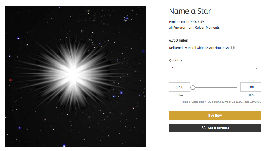 For just 6,700 Etihad miles, you can give someone the eternal gift of naming a star. I did a bit of research to see how official this would be and found there are quite a few commercial companies offering naming rights. So while I'm not 100% sure, I don't think your loved one's descendants will be able to call up NASA in a hundred years and confirm the star is named in accordance with the certificate that Etihad (i.e.: Etihad's third party vendor) promises to send.