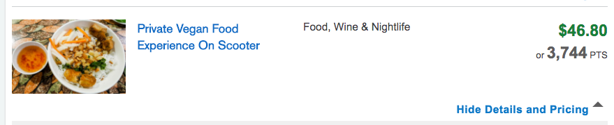 If you're visiting Ho Chi Minh, Vietnam, any time soon and think to yourself "wow, I could really go for some vegan cuisine after a few near-death motorbike experiences," then you're in luck. Chase Sapphire Preferred cardholders can redeem 3,744 Chase Ultimate Rewards points (slightly more or less if you only have a Freedom or Reserve card) for an evening city tour and vegan dish tasting experience.