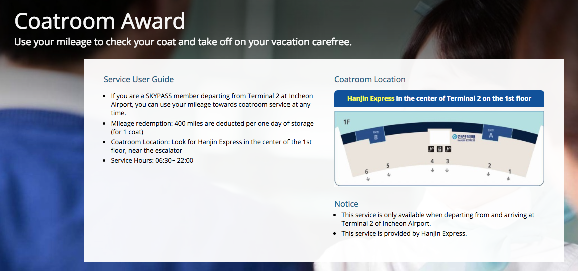 Korean SKYPASS members departing from the new Terminal 2 at Seoul Incheon International Airport (ICN) can use any Hanjin Express location to store your coat for a cost of 400 miles per day, per coat. I imagine if it's the dead of winter in Korea and you're headed to Hawaii, you need your coat to get to the airport but certainly don't want to lug it around Maui. Personally, I'd recommend having a friend drop you off at the train in Seoul and then running quickly run onboard sans coat in order to save your SKYPASS miles for otherwise more valuable redemptions.